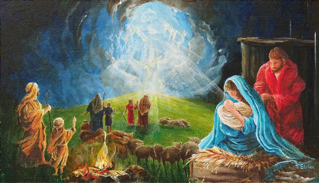Kerst schilderij: de herders kijken van een afstand naar de engelen die Ere zij God zingen. Rechts zie je Jozef en Maria in de stal met de Heere Jezus.